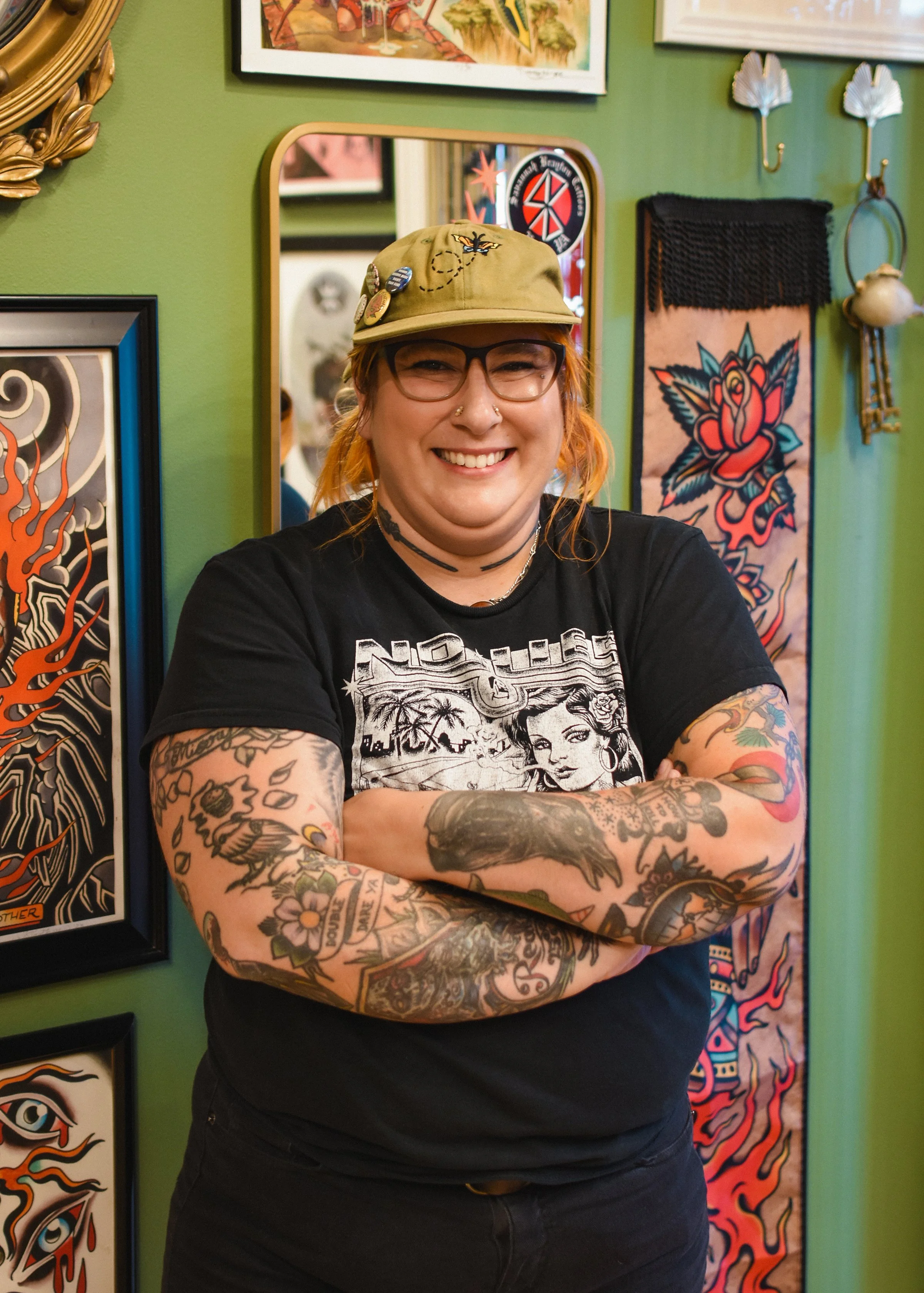 Savannah, owner and artist at Double Dare Tattoo, specializes in bold, vibrant traditional tattoos. She started tattooing in the NJ/PA area in 2008, developing a unique style influenced by classic Japanese and American traditional designs. Alongside traditional designs, she excels in black dotwork stipple tattoos. Her favorite subjects include big cats, birds of prey, mythical dragons, and classic American motifs, showcasing her creativity.